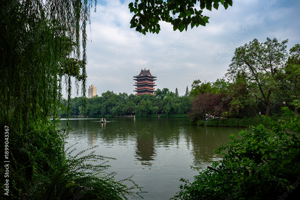 Fototapeta Traditional Chinese Pagoda Reflected in a Calm Lake Surrounded by Lush Greenery