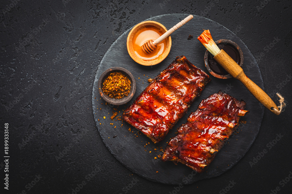 Fototapeta Barbecue pork spare ribs with spices and honey as top view on an old rustic boar