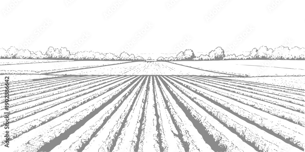 Fototapeta Stylized black and white illustration of cultivated agricultural fields with rows stretching to the horizon, symbolizing farming and nature