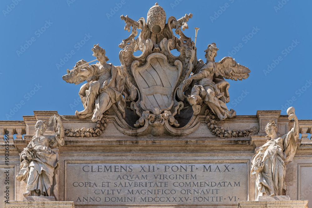 Fototapeta Italy - Rome - Trevi Fountain - Papal coat of arms crowns palace pediment alongs