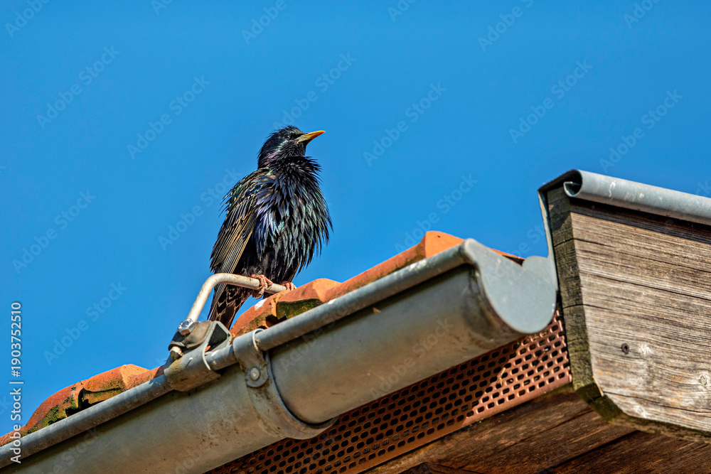 Fototapeta A singing and courting bird Starling (Sturnus vulgaris)
