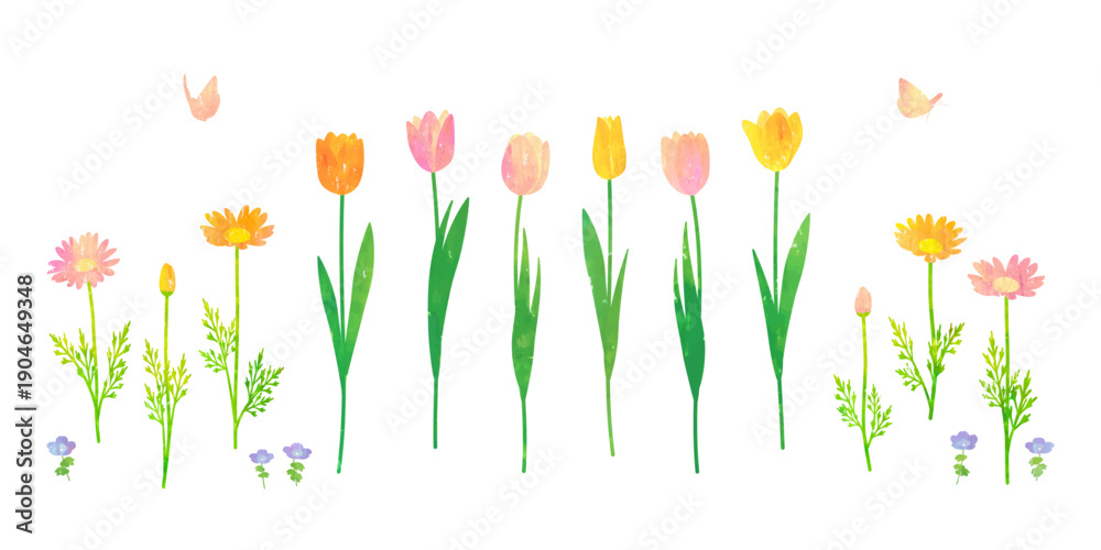 Fototapeta Vector illustration of spring flowers such as tulips and marguerites painted with watercolor and pastel