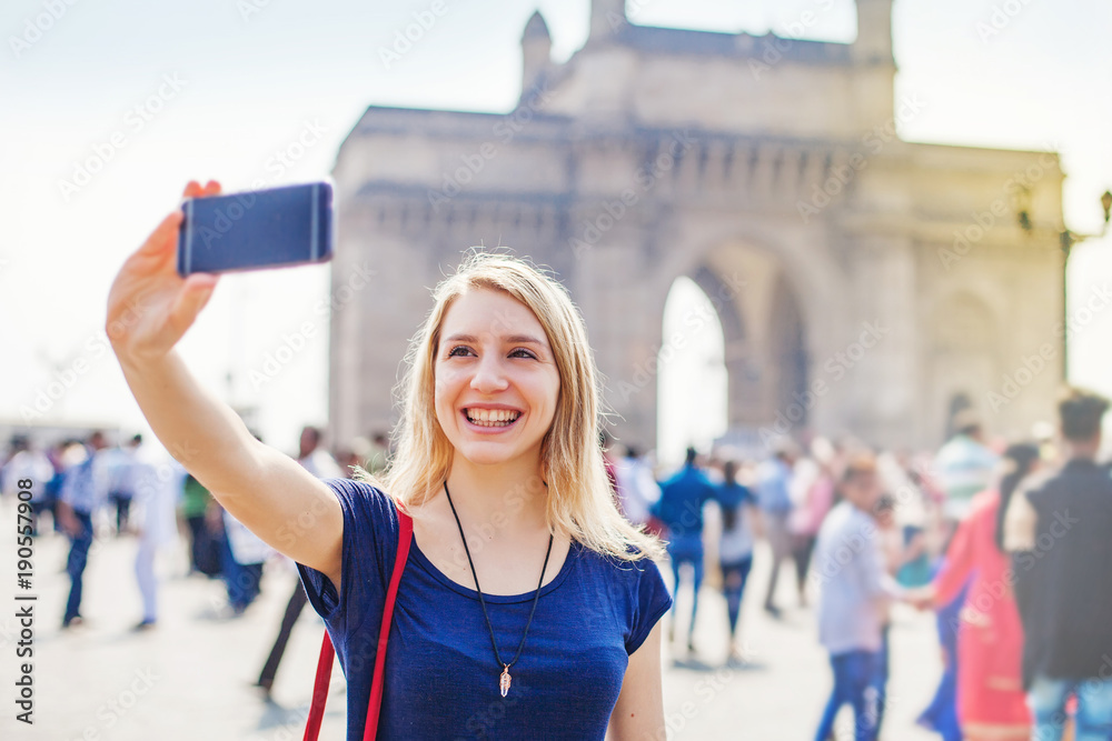 Fototapeta Caucasian woman posing in front of Gateway of India in Mumbai and taking selfie