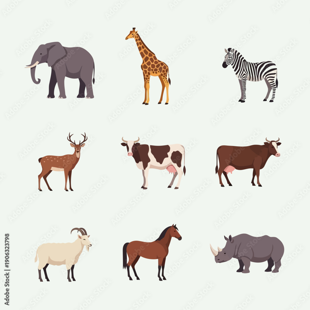 Fototapeta Collection of various wild and domesticated animals in modern illustration style