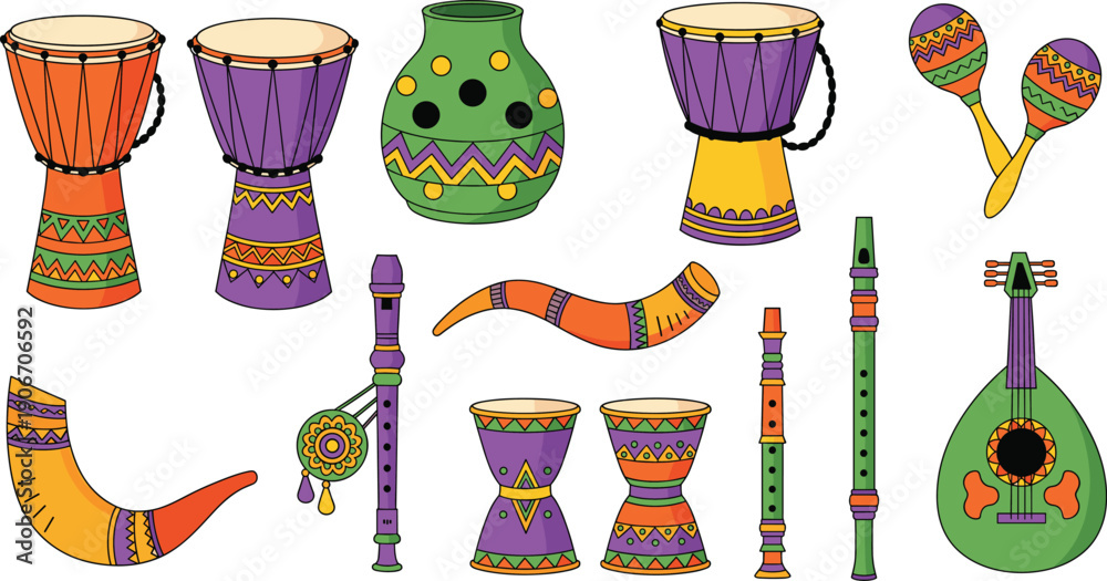 Fototapeta Hand drawn vector illustration set of ethnic musical instruments including djembe drums maracas flute horn and lute with colorful tribal patterns and ornaments