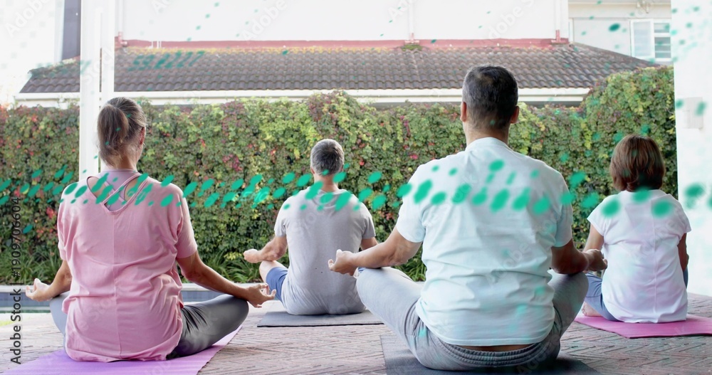 Fototapeta Practicing four adults seated meditating on patio, with pink purple gray mats an