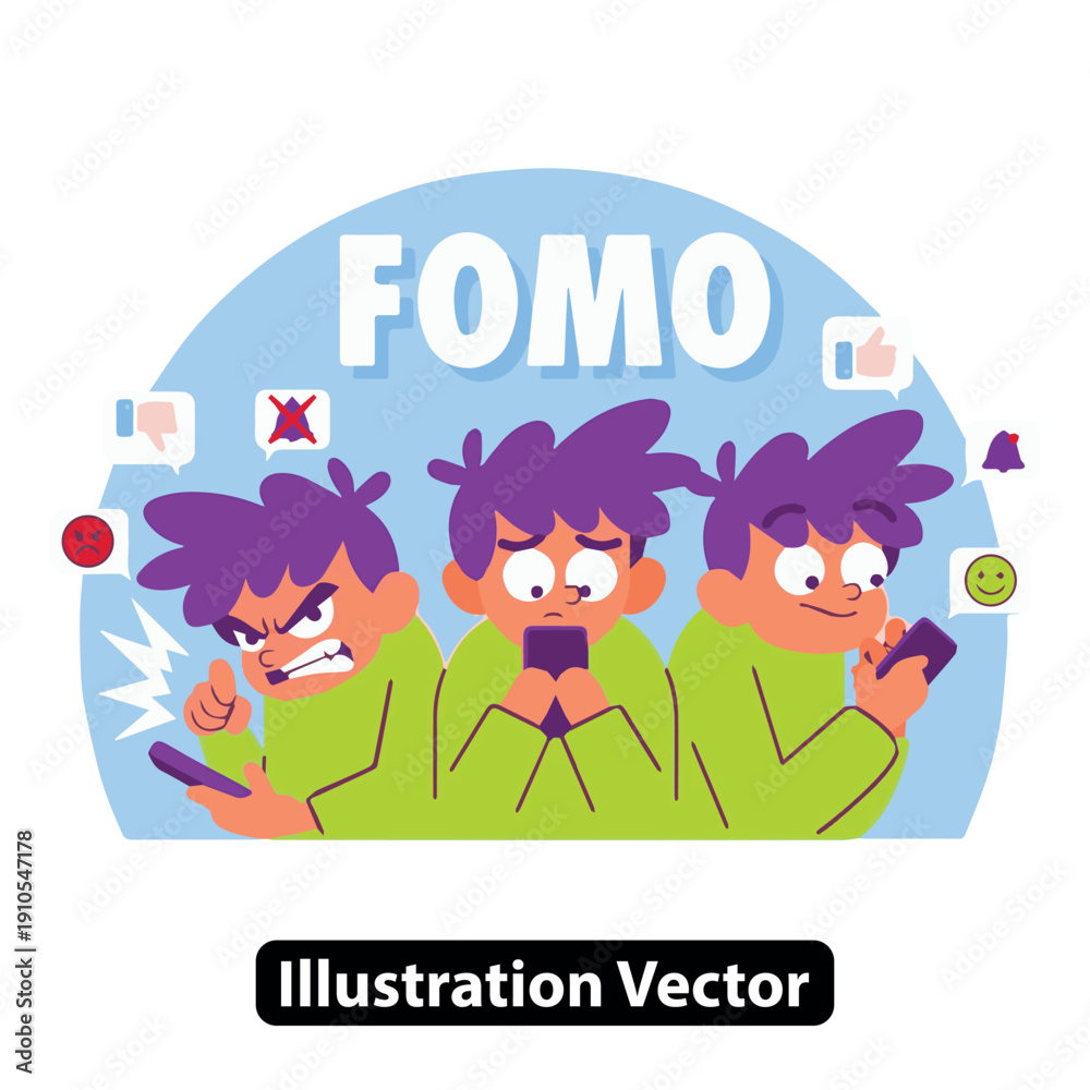 Fototapeta Cartoon characters experiencing FOMO while using their mobile phones in a humoro
