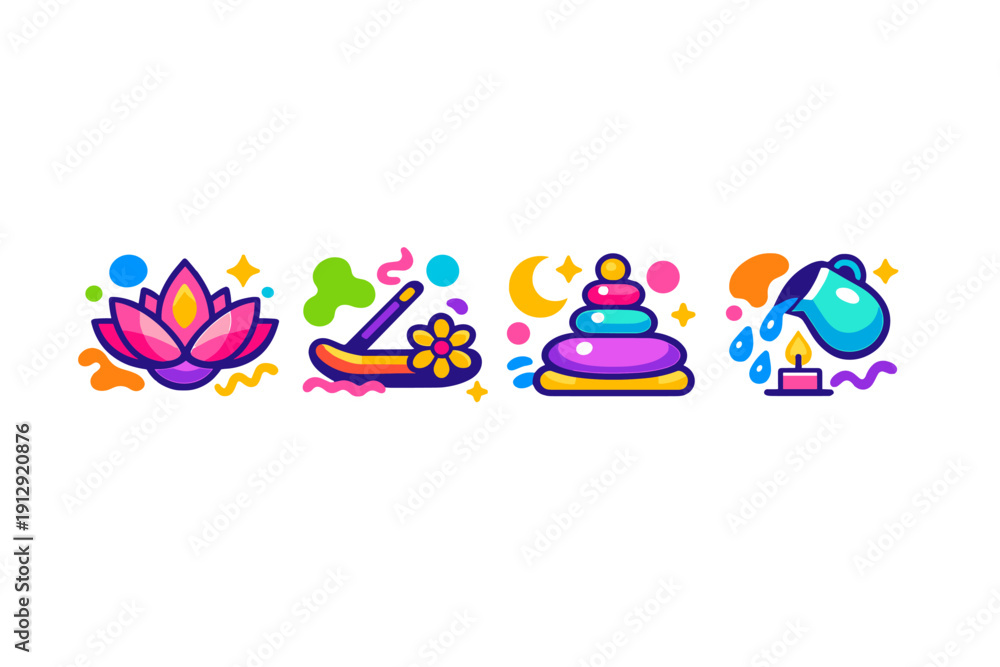 Fototapeta A set of four vibrant, stylized icons representing wellness and meditation, featuring a lotus flower, incense burner, stacked zen stones, and a water pitcher with a candle