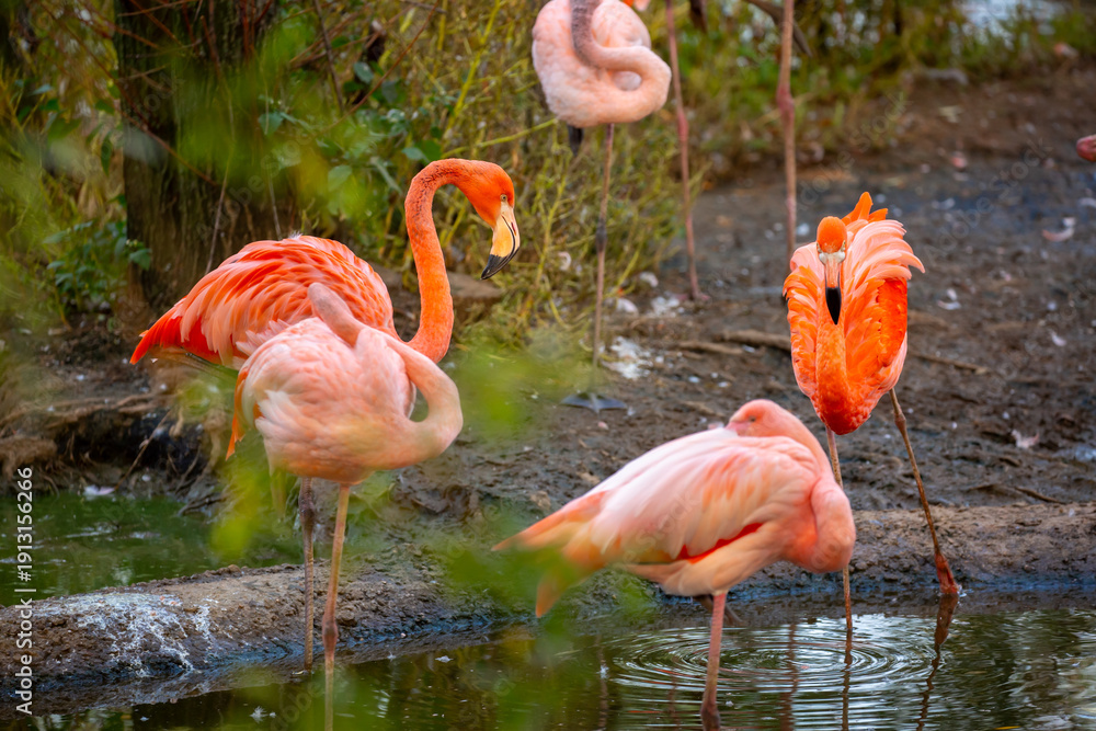 Fototapeta Pink flamingos stroll along the coast