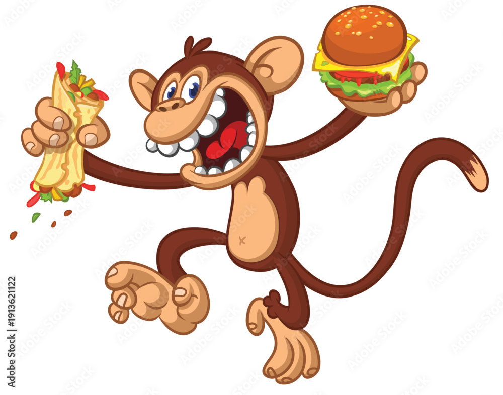 Fototapeta Cartoon funny monkey chimpanzee holding hamburger or cheeseburger or falafel in his hands