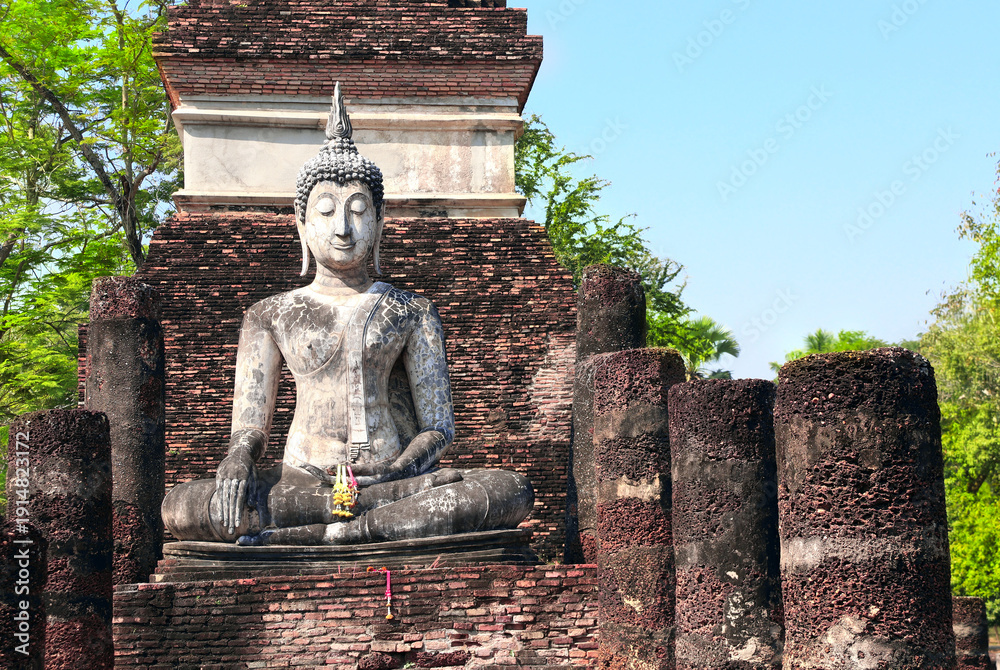 Fototapeta Ancient stone Buddha statue, Wat Sa Si temple, Sukhothai historical park