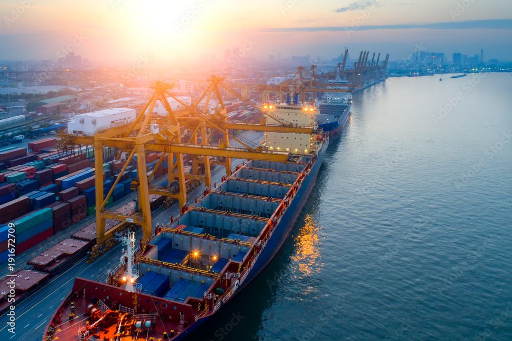 Fototapeta Containers yard in port congestion with ship vessels are loading and discharging operations of the transportation in international port