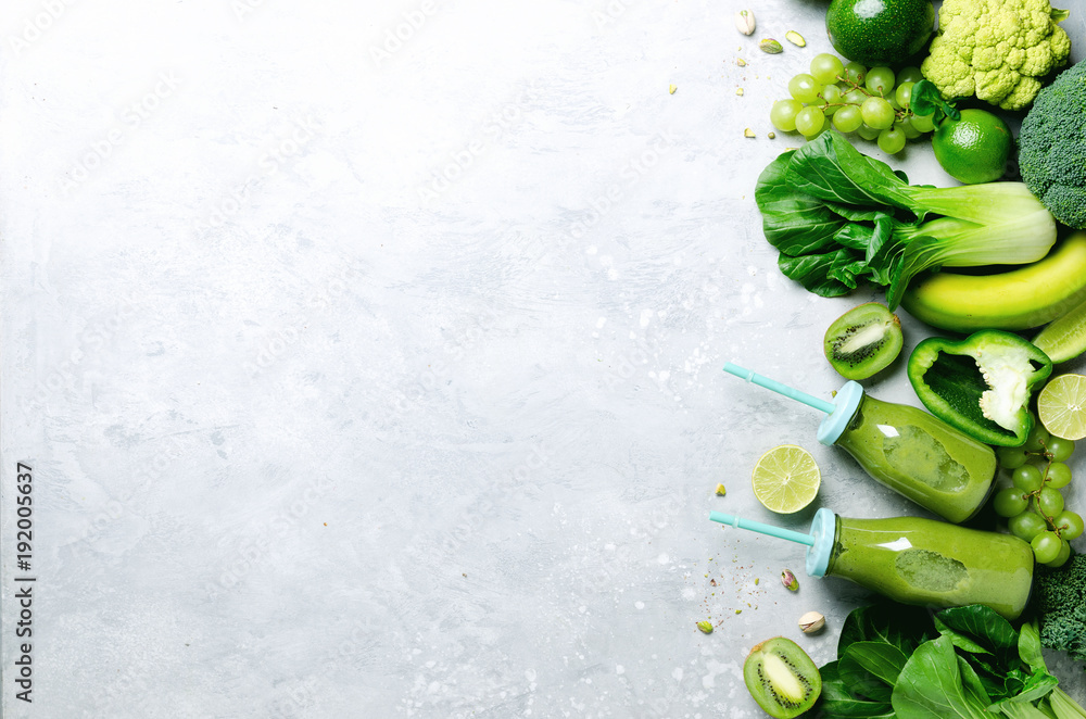 Fototapeta Green smoothie in glass jar with fresh organic green vegetables and fruits on grey background