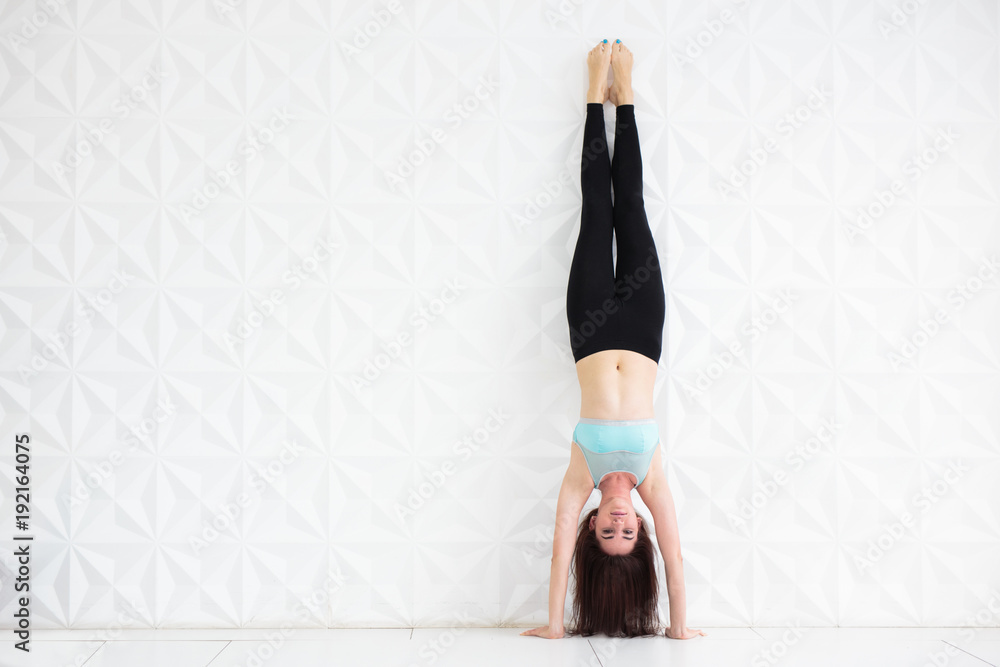 Fototapeta Young brunette woman doing a handstand over a white wall