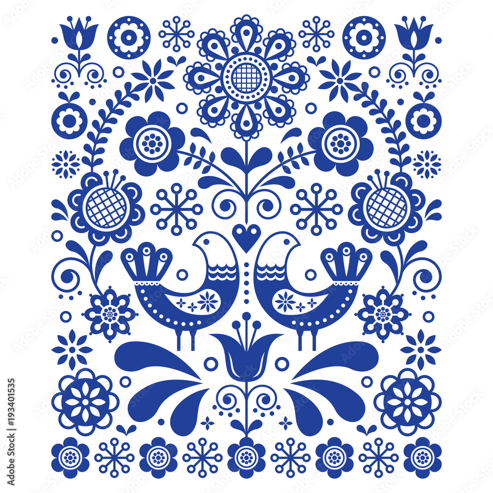 Fototapeta Scandinavian cute folk art vector decoration with birds and flowers, Scandinavia