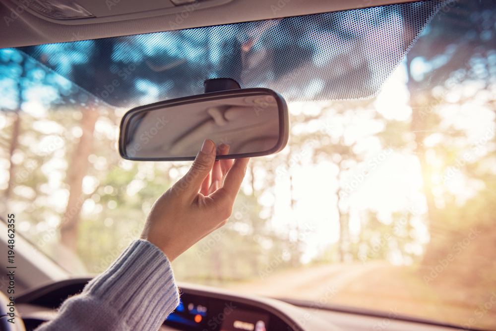 Fototapeta Close up Hand adjusting rear view mirror. Safety concept.
