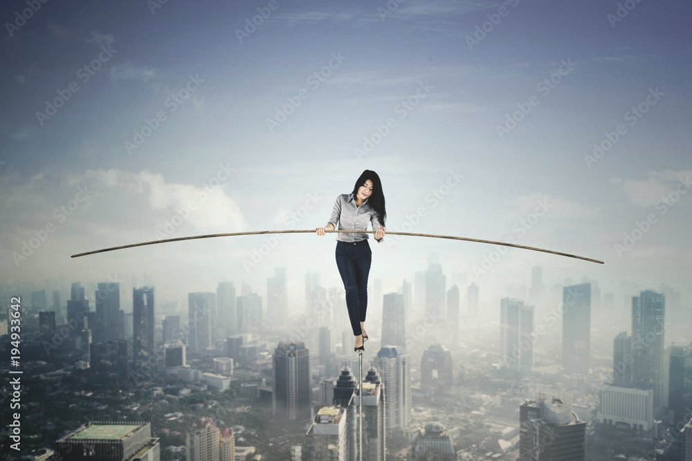 Fototapeta Beautiful businesswoman balancing on a rope