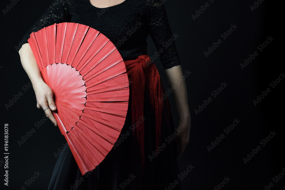 Fototapeta Low Key photo of Flamenco Dancer middle age woman posing with her red fan
