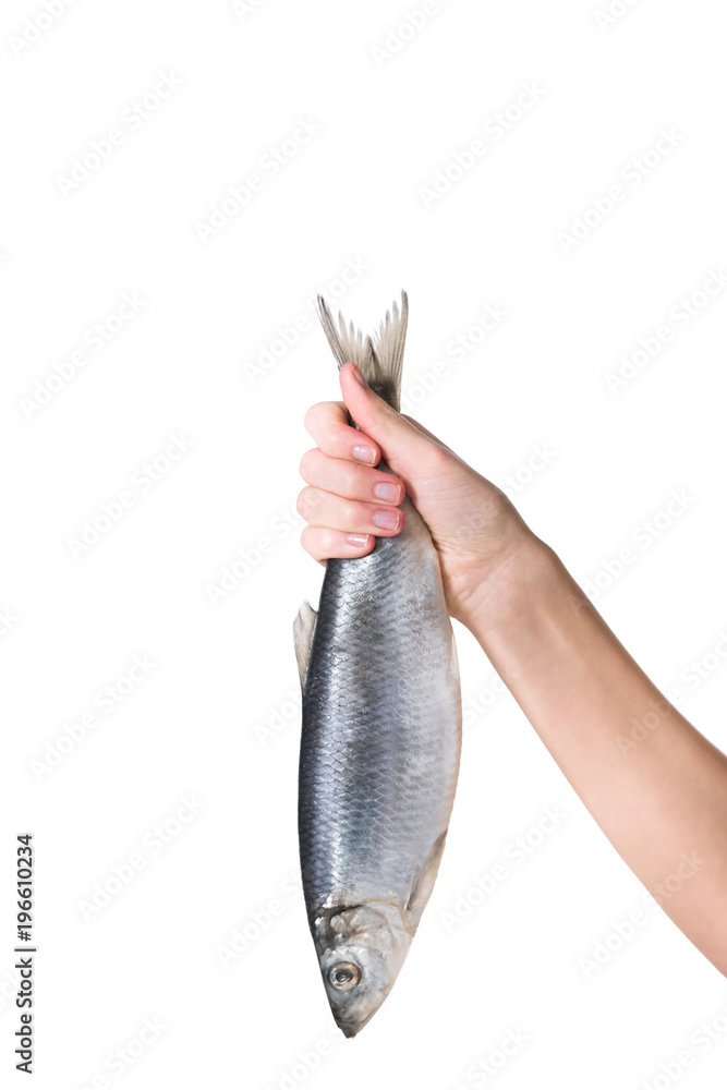 Fototapeta cropped image of woman holding fish in hand isolated on white