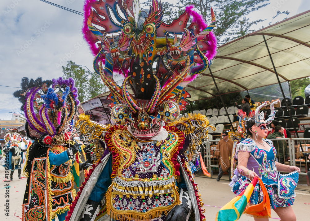 Fototapeta Oruro carnival in Bolivia with masked dancer during procession