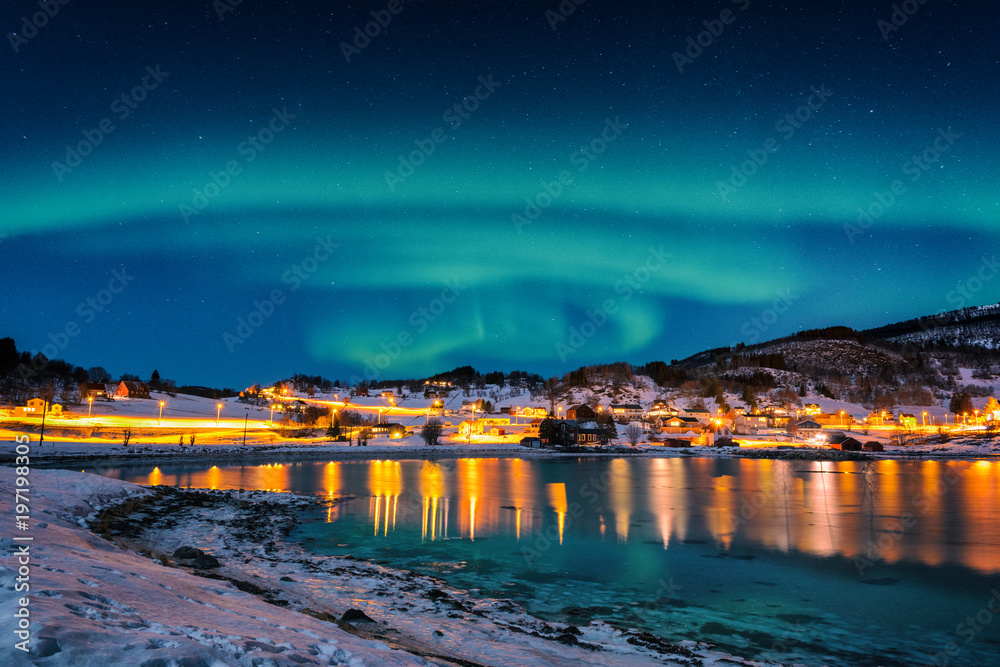 Fototapeta Northern lights, Aurora borealis in night sky over Gausvik, Lofoten Islands, Norway