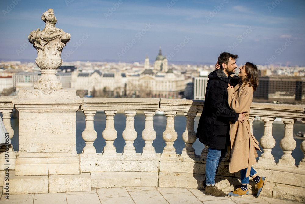 Fototapeta Couple in love hugging of the magnificent landscape view of Budapest, Hungary