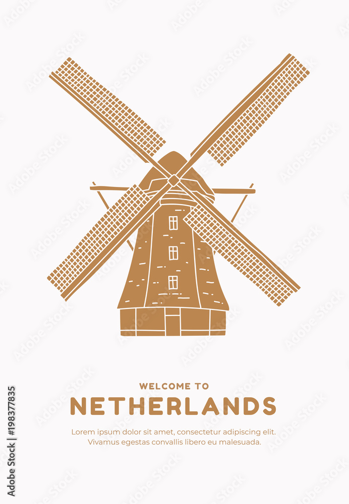 Fototapeta Hand drawn windmill on white background with inscription Welcome to Netherlands