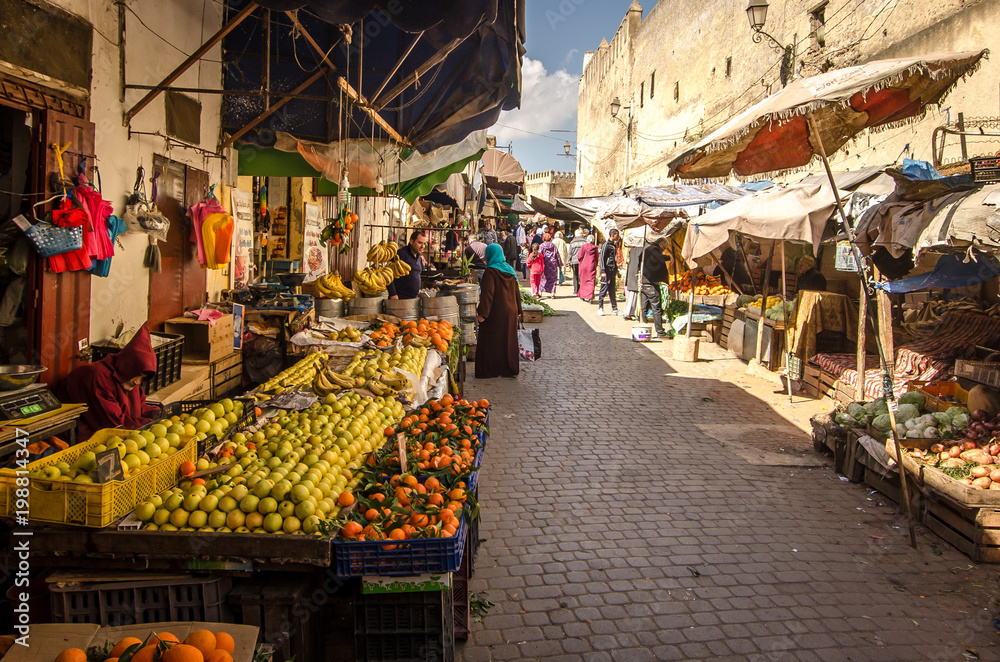 Fototapeta FEZ, MOROCCO - Februari 25, 2018: Fruit marking in the old Medina of Fez city du