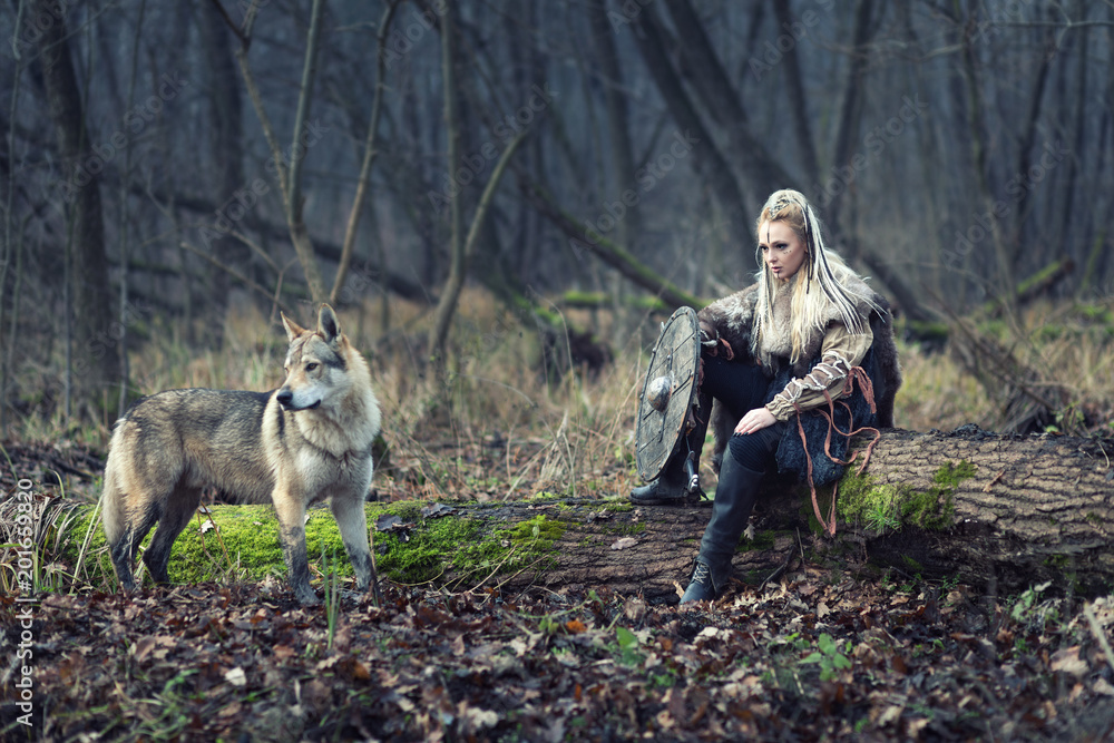 Fototapeta Viking warrior woman with ax and shield, next to an wild wolf, looking for dange