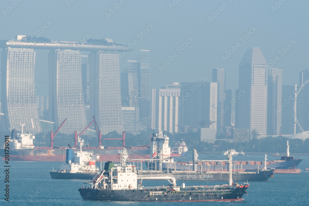 Fototapeta cargo ships and city of singapore