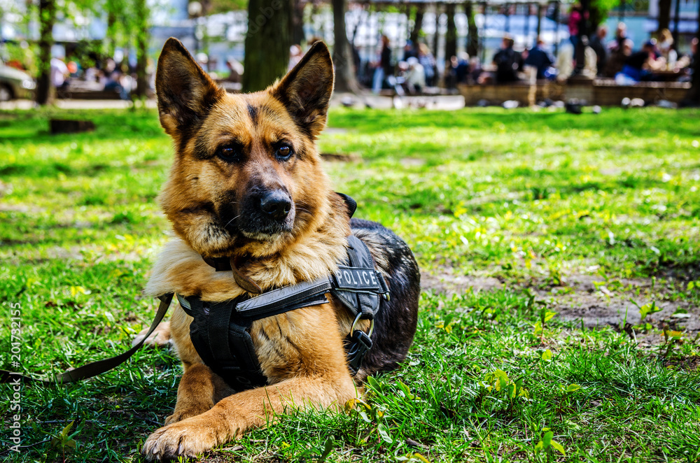Fototapeta The police sheepdog lies on the grass.