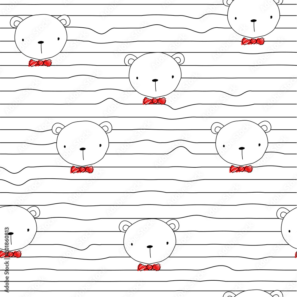 Fototapeta Seamless pattern with funny bear and red bow tie
