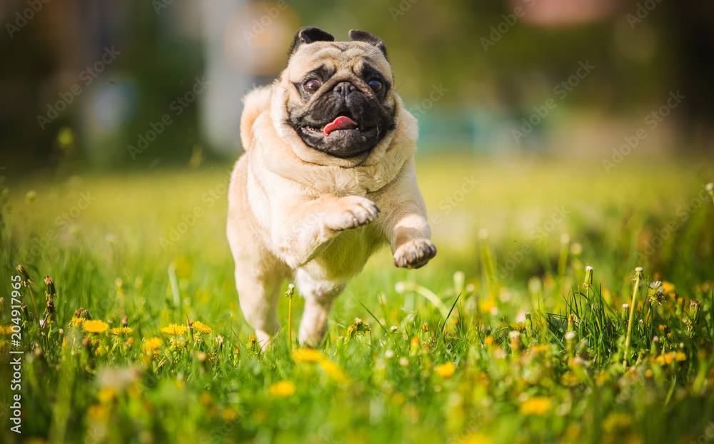 Fototapeta Happy dog ​​runs, darts in motion against the background of green grass and dandelions outdoor