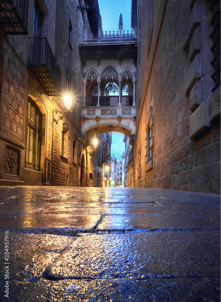 Fototapeta Illuminated medieval street Carrer del Bisbe with Bridge of Sighs in Barcelona a