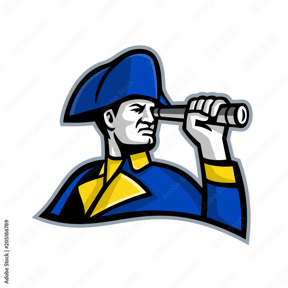 Fototapeta Mascot icon illustration of head of a British admiral of the fleet looking thru a telescope viewed from side on isolated background in retro style