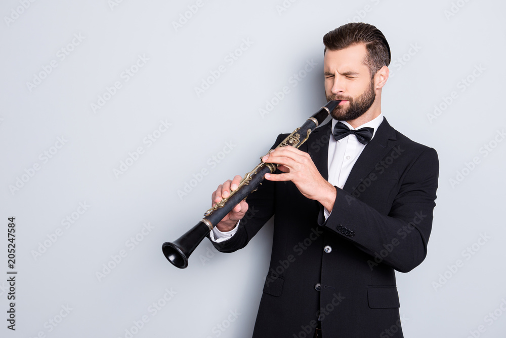 Fototapeta Portrait with copy space, empty place of stylish talented man with hairstyle in