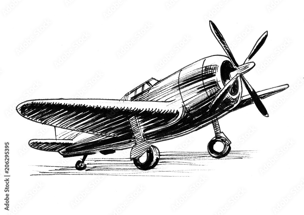 Fototapeta Vintage military plane. Ink black and white illustration
