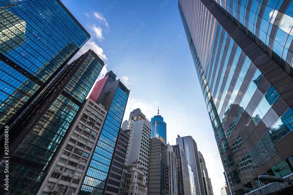Fototapeta up view of modern glass building in hongkong china