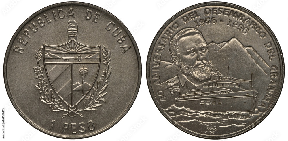 Fototapeta Cuba Cuban coin 1 one peso 1996, arms, shield, 40th anniversary of guerillas dis