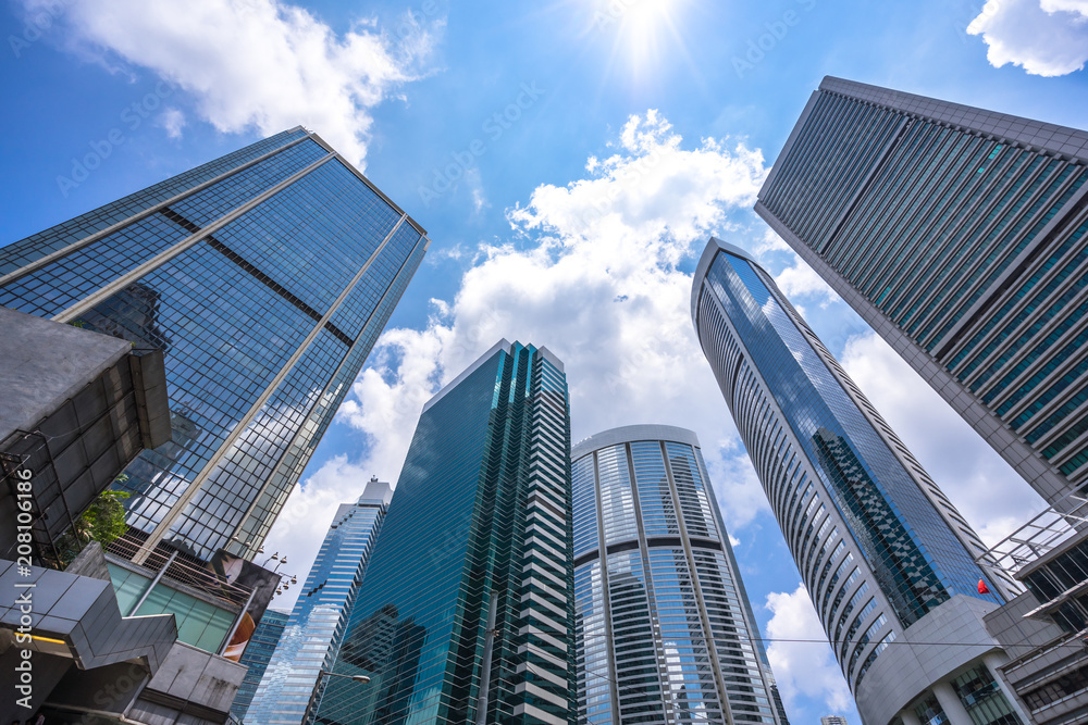 Fototapeta up view of modern office building in hongkong china