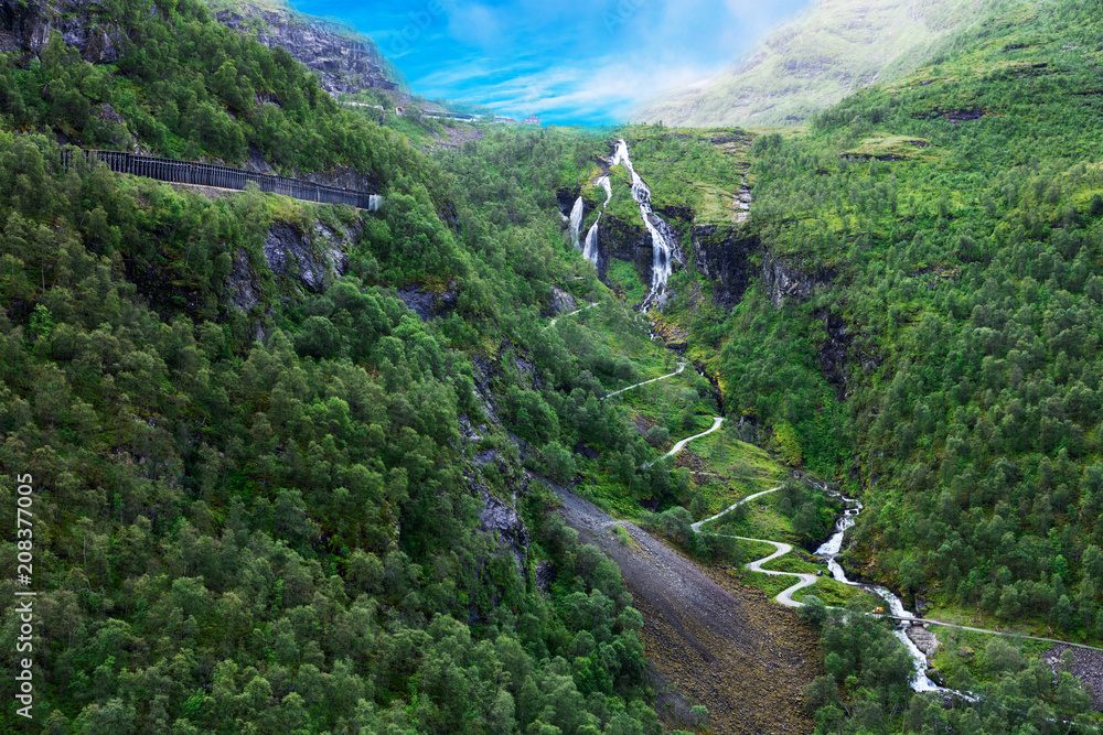 Fototapeta road and waterfalls in famous Flam valley