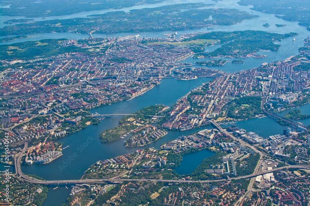 Fototapeta Aerial over Stockholm Sodermalm Old Town island Essingeleden Djurgarden