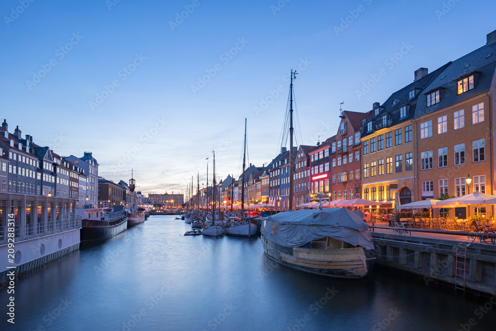 Fototapeta Nyhavn with the canal at night in Copenhagen city, Denmark