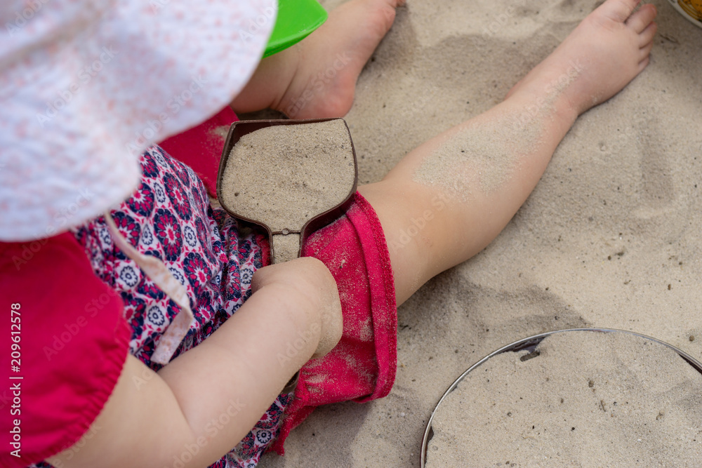 Fototapeta child with shovel playing in the sandpit