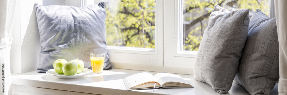 Fototapeta Real photo of windowsill with three grey pillows, open book, green apples on pla