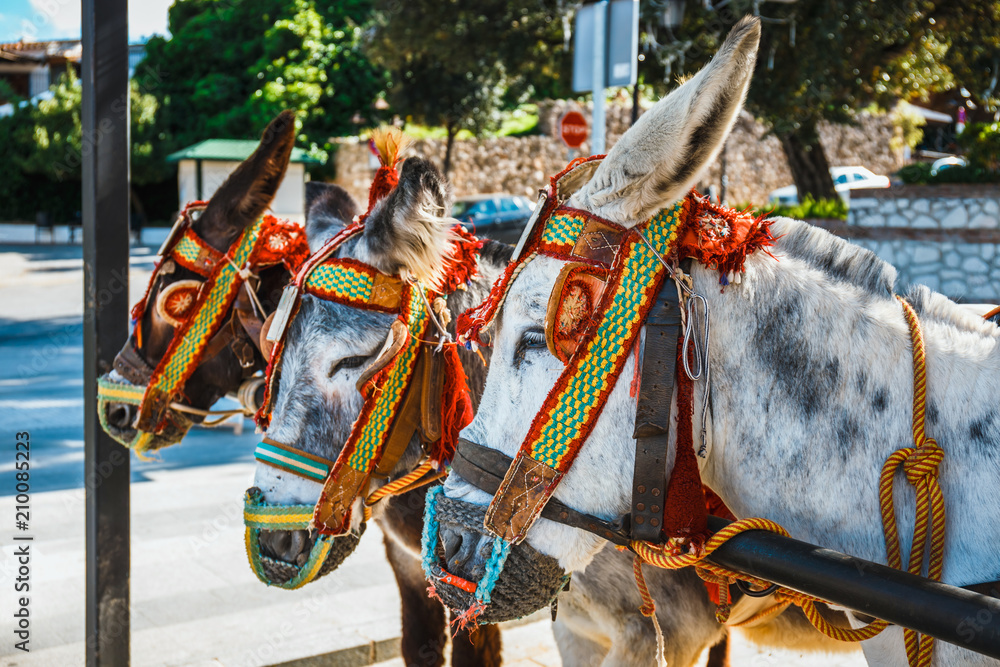 Fototapeta Close up of colorful decorated donkeys famous as Burro-taxi waiting for passengers in Mijas, a major tourist attraction