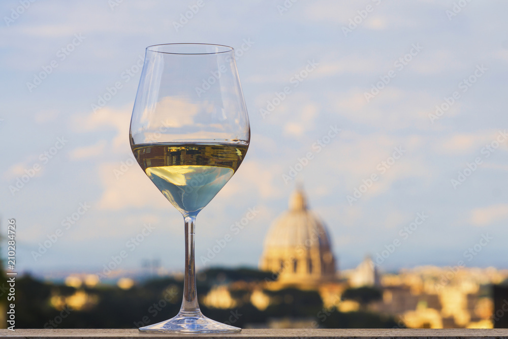 Fototapeta Glass of Italian white wine with St Peter's basilica, Rome, in the background