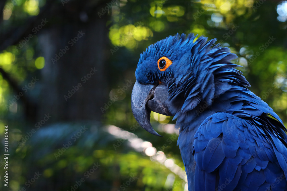 Fototapeta Close up of vivid blue Hyacinth Macaw, blue parrot portrait with blurred backgro