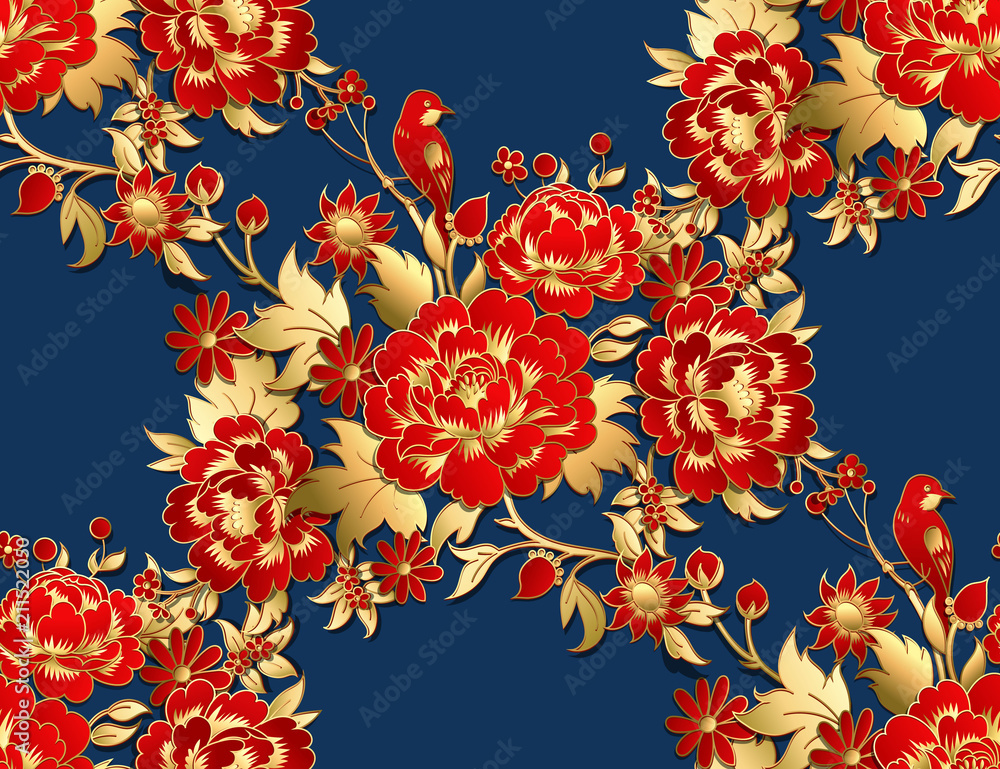 Fototapeta Seamless pattern with red flowers with golden leaves