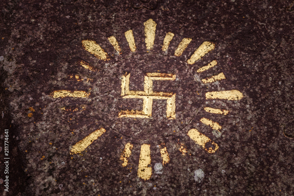 Fototapeta Swastika carved and drawn on a rock - an ancient solar hinduism symbol in the In